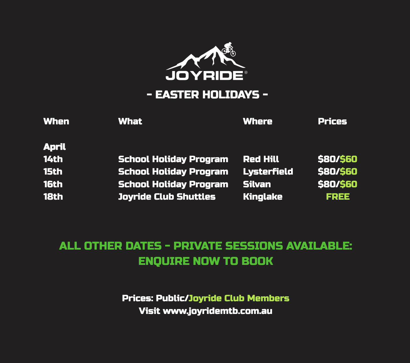 Joyride was built to lift the standard of mountain biking in Australia. Better coaching. Better events. Better pathways. A place where riders progress, parents feel supported, and the community thrives.